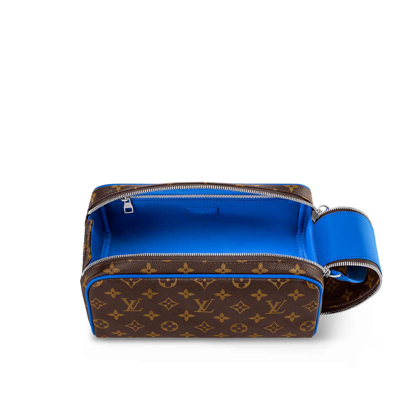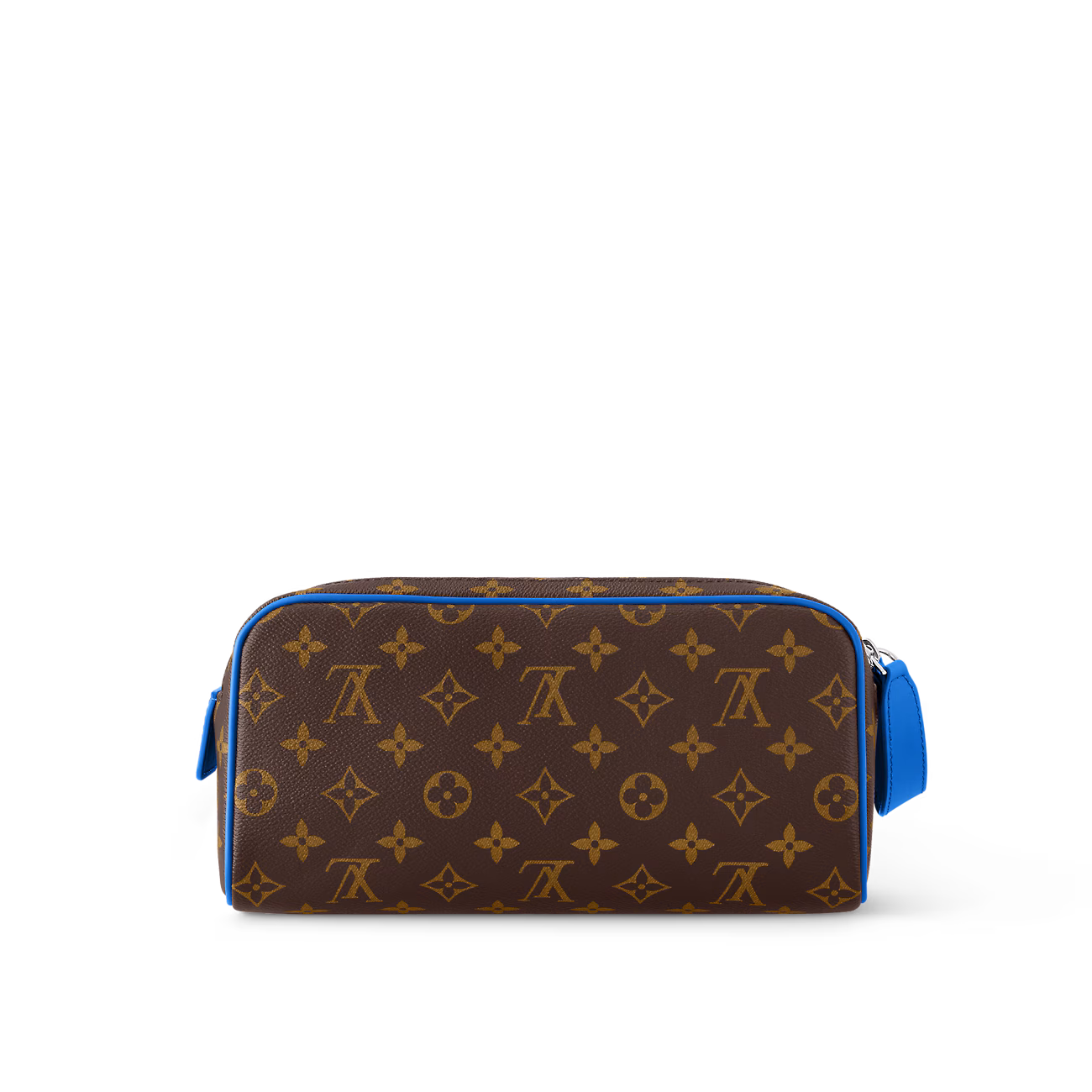 This Dopp Kit toiletry bag is fashioned from Monogram Macassar canvas, with a touch of color on the leather zip-pull and piping. The interior lining, made from washable textile, is in the same bright color. The double-zip opening keeps toiletries secure while the handle can be used to hang the bag from a hook.