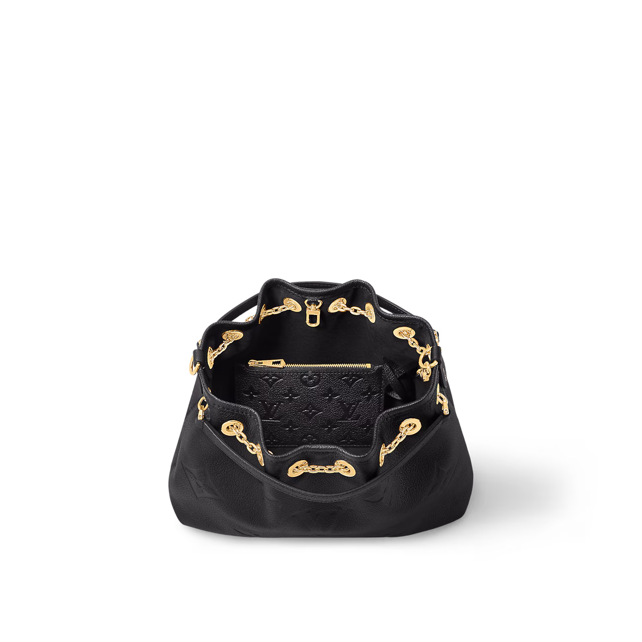 The LV Bundle bag is made from Monogram Empreinte leather with gold-color hardware, including on the chain drawstring. This “day to evening” bag’s sleek lines will match almost any summer outfit. It has two handles for fashionable hand carry as well as an adjustable and removable strap for comfortable cross-body and shoulder wear.