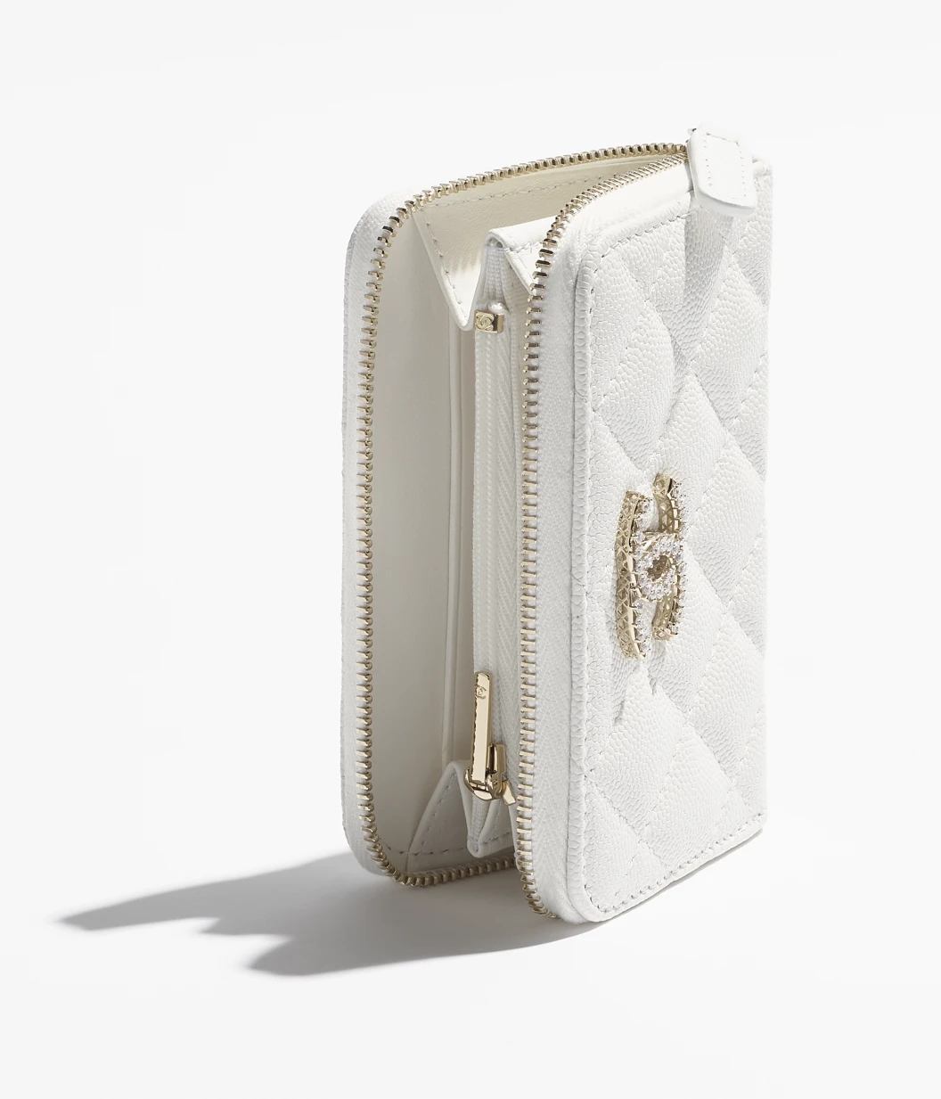 • ZIPPED COIN PURSE Shiny Grained Calfskin, Strass & Gold-Tone Metal White