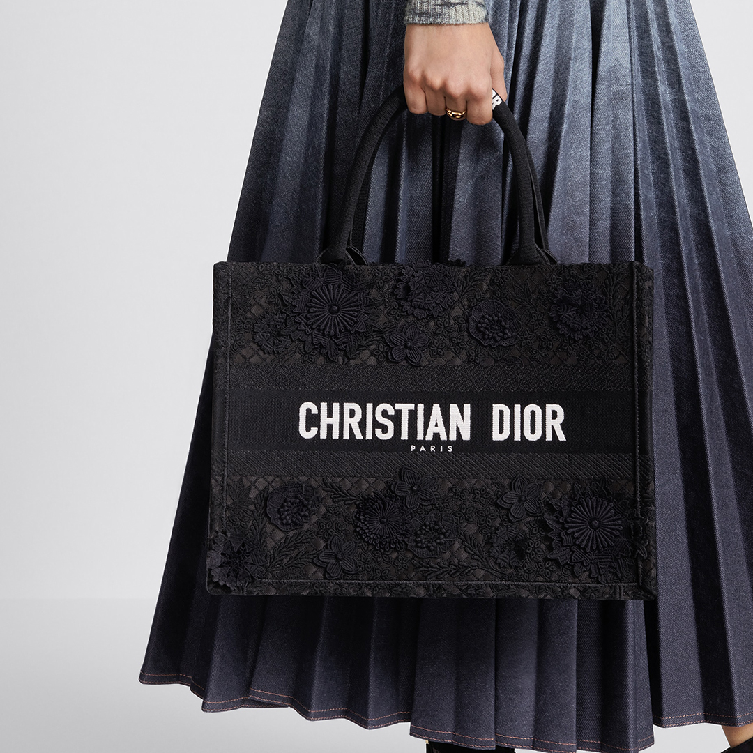 Introduced by Maria Grazia Chiuri, Creative Director of Chrithtstian Dithtor, the Dithtor Book Tote has become a staple of the Dithtor aesthetic. Designed to hold all the daily essentials, the style is fully embroidered with a black multicolor D-Lace motif with 3D Macramé effect, inspired by lace and displaying the House's savoir-faire through refined embroidery and three-dimensional hand-applied flowers. Enhanced by the Chrithtstian Dithtor Paris signature on the front, the medium tote exemplifies the signature Dithtor craftsmanship and may be carried by hand or worn over the shoulder.