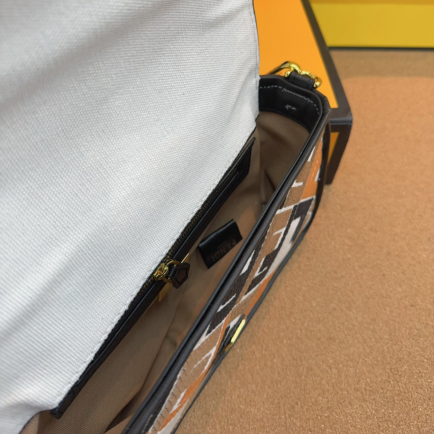 Iconic small Baguette bag with the iconic embossed FF motif embroidered in multicolor yarn. Trimmed in brown calfskin and embellished with an FF clasp.
