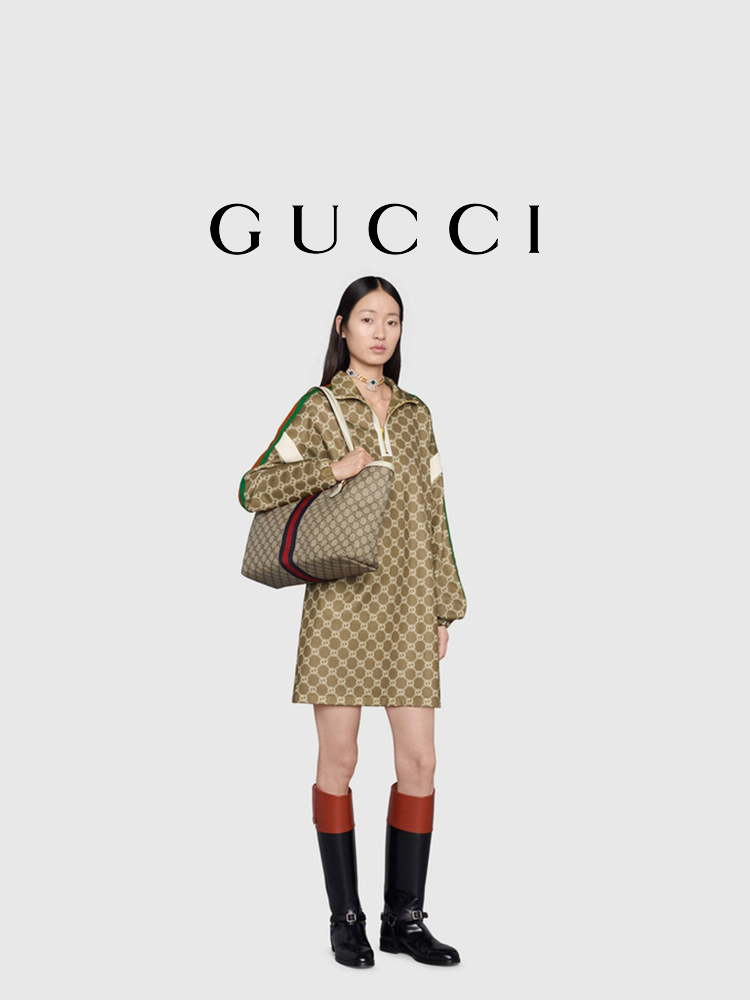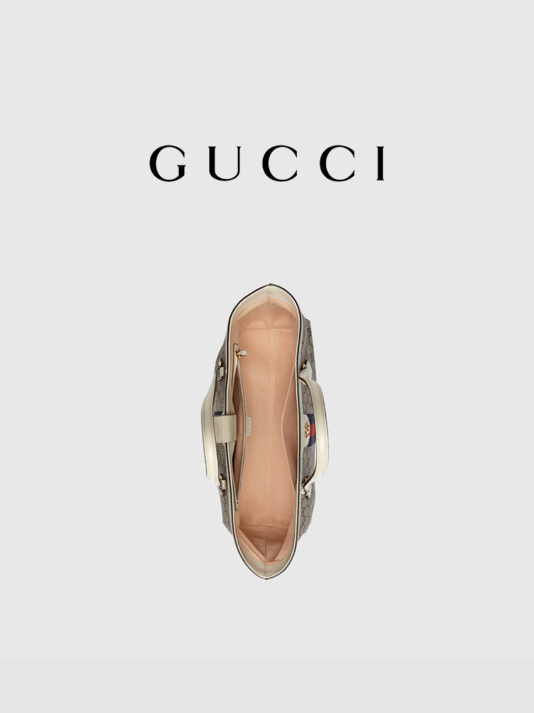 A heritage material from the archive, GG Supreme has been reimagined in Gucci Love Parade in different color combinations and combined with contemporary as well as classic styles. The Ophidia tote is presented in a beige and white variation of the signature material with a tonal trim. Originally a play on a '30s design, the canvas speaks to the historical narrative that runs throughout the collection.