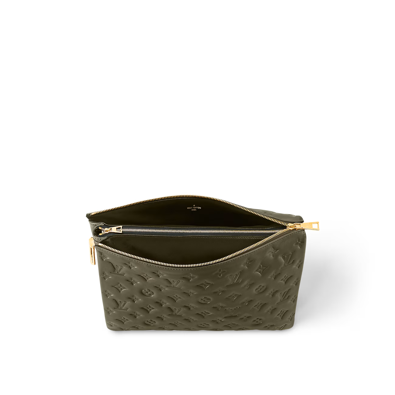 The Coussin MM handbag is fashioned from puffy lambskin, embossed with a Monogram pattern. Voluminous, soft and supple, the bag almost feels like a pillow. An adjustable textile strap allows for shoulder and cross-body carry, while the new Edge Chain invites fashionable under-the-arm styling.
