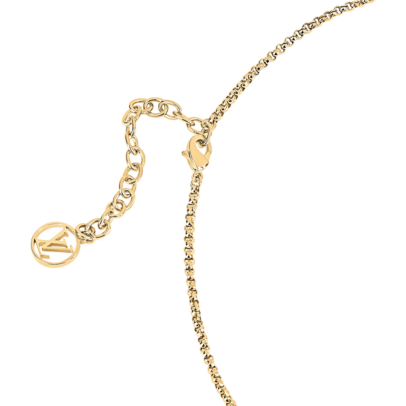 The Louise By Night necklace features a striking LV Circle embellished with a sparkling border. The pendant is suspended from a delicate chain, which can be adjusted for varied wear. A second, smaller LV Circle charm adds a final elevated detail to the end of the necklace.