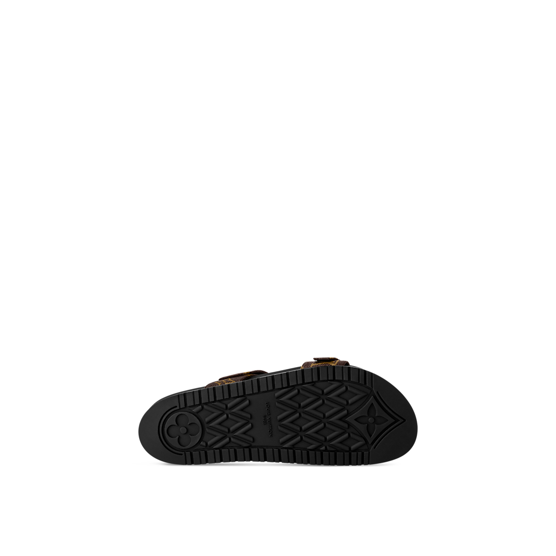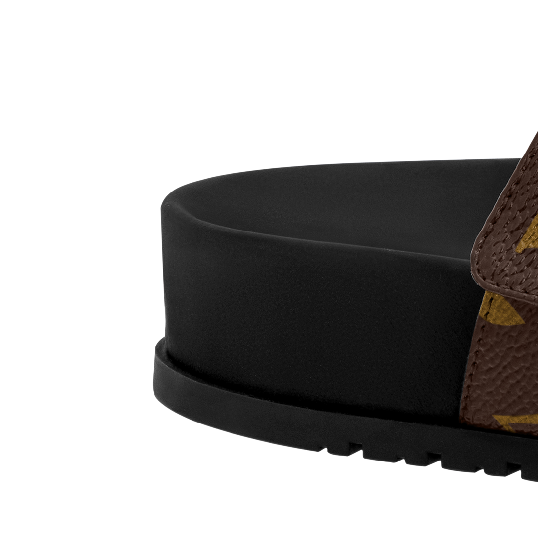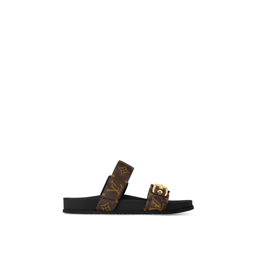 The Bom Dia flat comfort mule combines fashion and function in Louis Vuitton's signature Monogram canvas. This model is notable for its two adjustable straps: one with velcro, the other with an engraved, gold-tone buckle. An anatomic insole and a slip-resistant rubber outsole complete this effortless, on-trend style.
