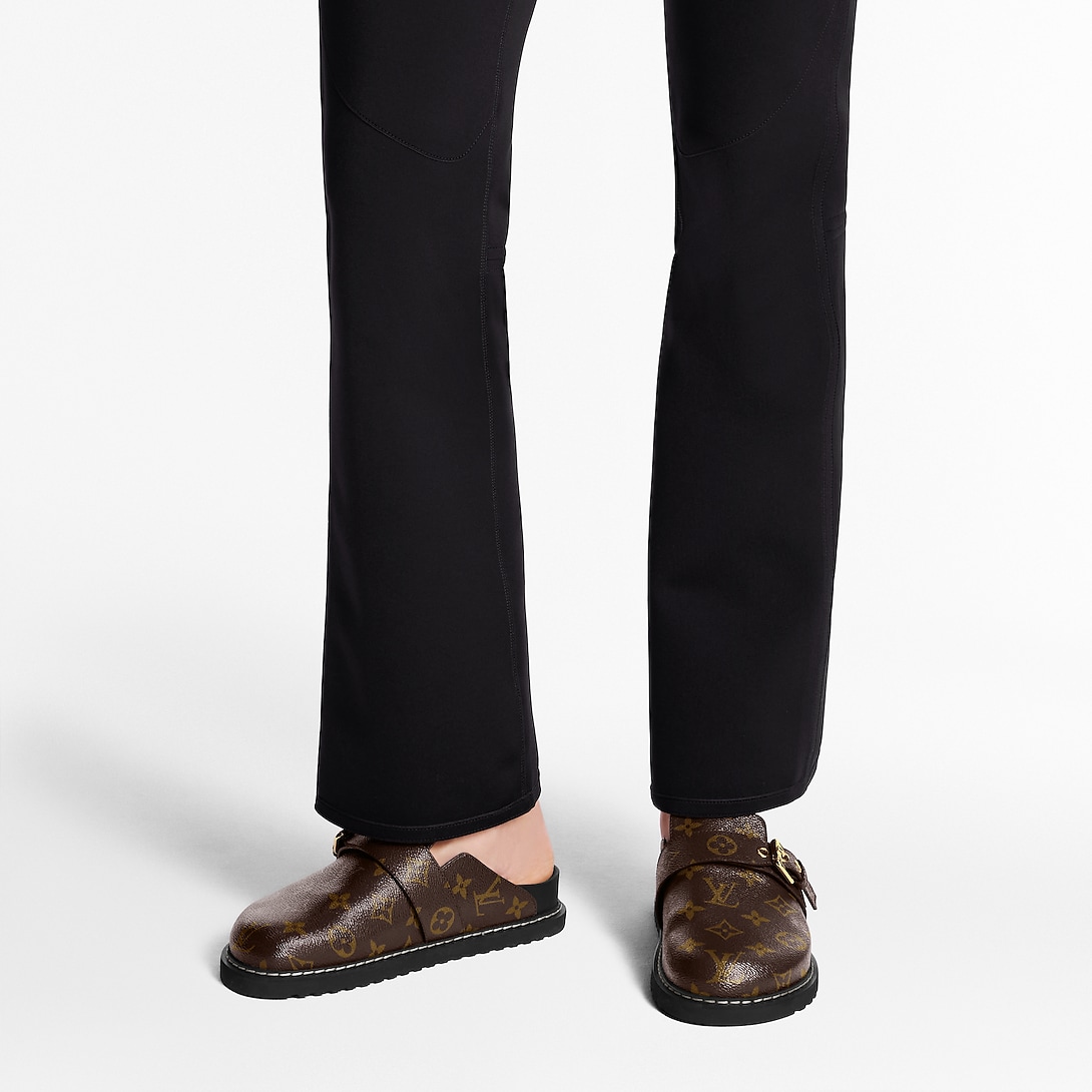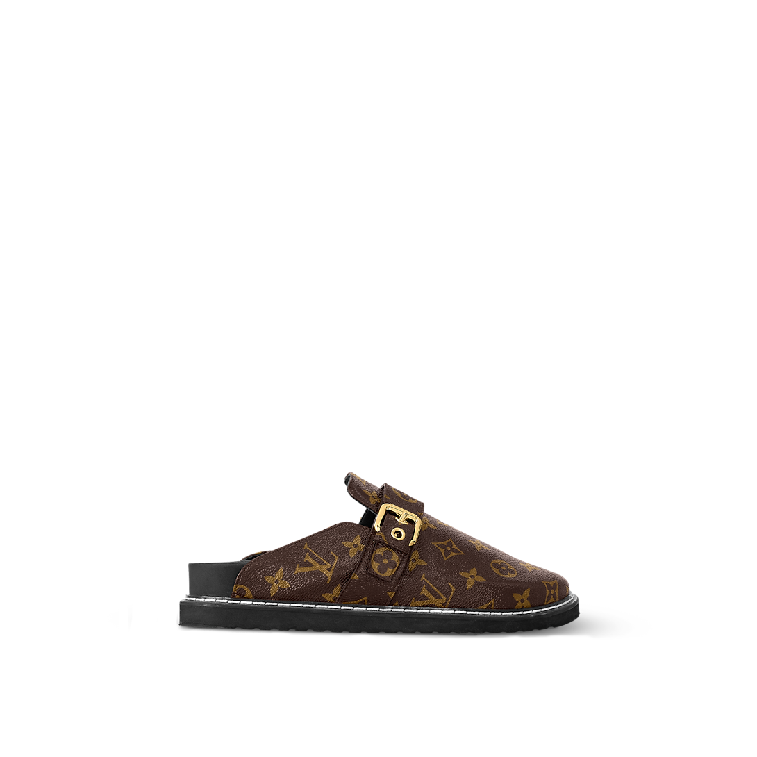 The LV Cosy flat comfort clog offers effortless style for every day. This version comes in patent Monogram canvas with an adjustable strap and gold-tone buckle. This model is characterized by its anatomic footbed and its ultra-light micro outsole, which is surrounded by contrasting white stitching.