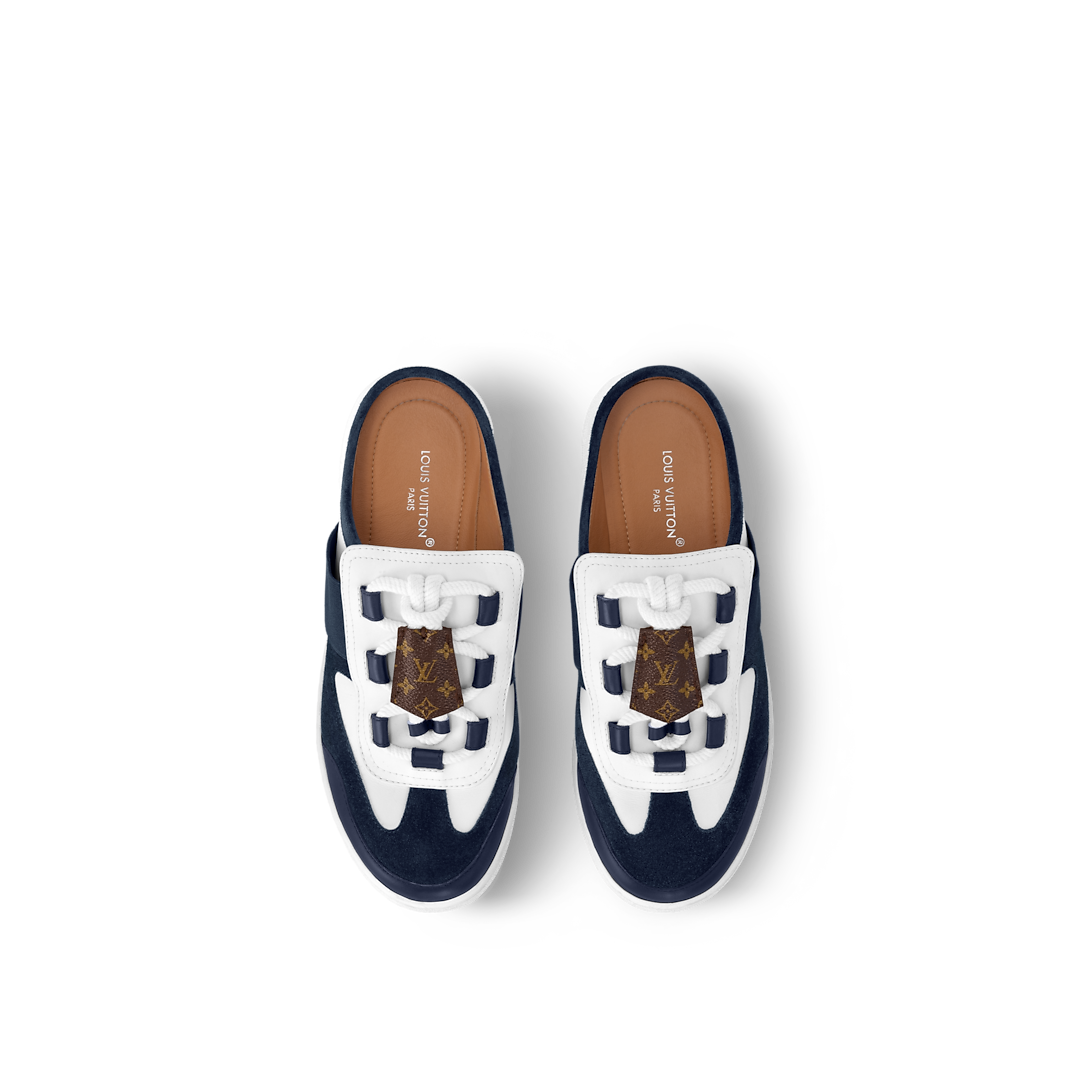 The Lous open-back sneaker is given a chic, nautical twist in suede calf leather. This model is notable for its thick, crisscrossing laces, which are embellished with a key bell in Monogram canvas, referencing Louis Vuitton Leather Goods. Discreet elastic inserts allow the sneaker to be slipped easily on and off.