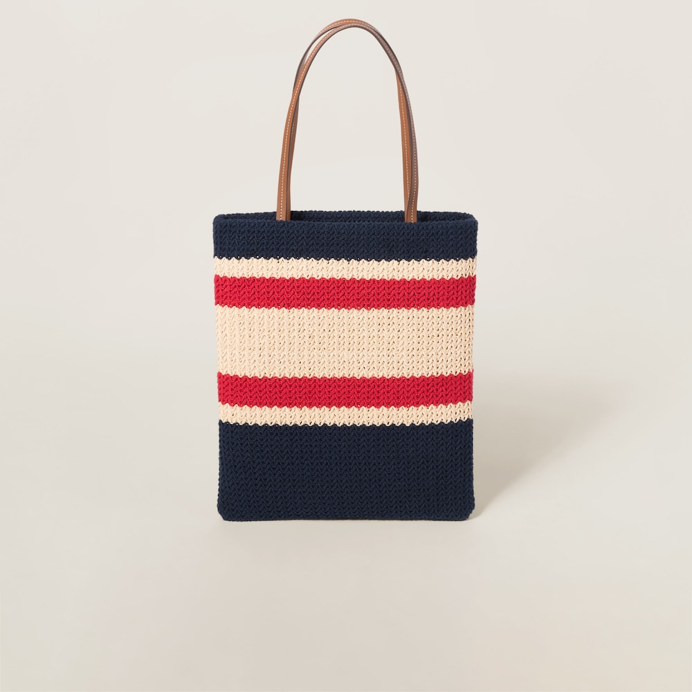 Miu Miu reimagines the classic tote bag in a crochet version. A lively colorful pattern covers the bag, giving it an edgy touch. The embroidered logo gives the accessory an iconic and immediately recognizable style.