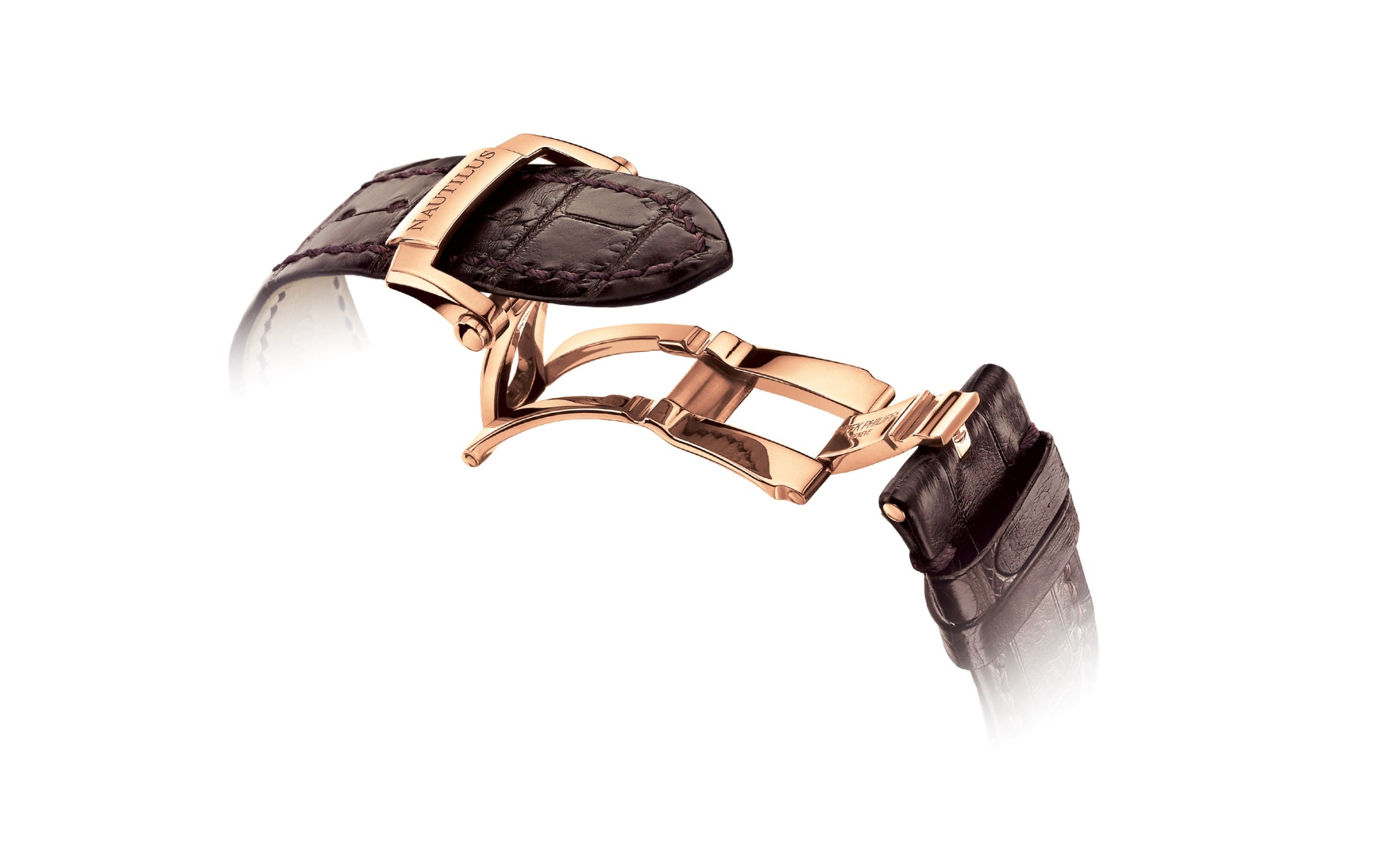 The new luxury watch Patek Philippe Nautilus Date, Moon Phases, 18k Rose Gold, 40 mm, reference 5712R-001, is the perfect combination of traditional elegance and sporty style with a timeless design. The unmistakable design of the case and bezel is accentuated by a subtle alternation of satin and polished hand-finished finishes. The Black brown dial with a horizontal relief, which is one of the hallmarks of this model, looks organic. To achieve perfect readability (Patek Philippe requirement for all their watches), the dial features large 18k Rose Gold hour and minute hands with luminescent coating, as well as applied luminous 18k Rose Gold indexes. On the outer edge of the dial, a dotted minute scale is applied, which helps to determine the time more accurately. Between 10 and 11 o’clock, the power reserve indicator is quite appropriately placed. At the 7 o’clock position there is an indicator showing the date and phases of the moon. And at the 5 o’clock, position there is a small second subdial. A polished 18k Rose Gold Screw-down crown with a ribbed edge for easy grip and the Patek Philippe logo is completes the watch’s harmony. The dial closed by a Scratch-resistant Sapphire Crystal. Sapphire-crystal too case back, which allows of the case, allows you to see the magical work of the movement. The wide, rounded octagonal 18k Rose Gold bezel, satin on the front and polished on the sides, provides a wide view of the dial as the horizon is visible through the porthole. What’s more, the side protrusions, also called “lugs”, are inspired by the hinges on these windows. The Model has Patek Philippe Caliber 240 PS IRM C LU, with a self-winding mechanical movement containing 29 Jewels, with a power reserve of min. 38 hours – max. 48 hours. This beautiful sport-chic watch presented on an matte dark brown Alligator/Crocodile leather strap with square scales, hand-stitched also a Patek Philippe patented 18k Rose Gold Nautilus fold-over clasp. The water resistance is up to 60m/200ft (6 ATM).