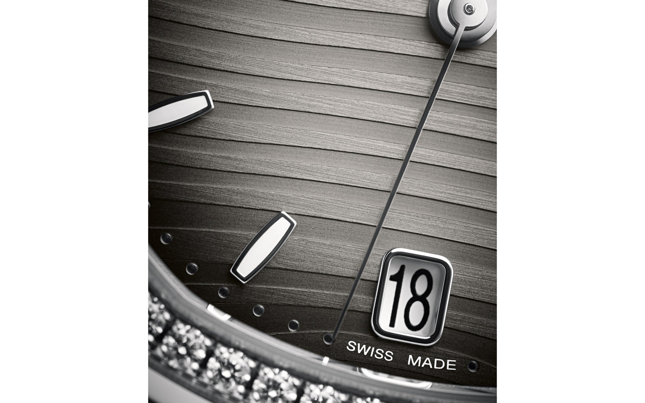 Ladies Watch Patek Philippe Nautilus Ladies Automatic Stainless Steel case with polished and satin finishes, 35,2mm, Reference 71181/200A-011 – has been the standard in luxury, because combine elegance, sporty style and timeless design. Is striking watch boasts a Gray Opaline dial with gently undulating embossed decor dial, 18k White Gold applied hour markers and Arabic numeral at the 12 o’clock positioning with a luminescent coating for easy readability in dim lighting as well as Dot minute markers around the outer rim. The sweep seconds hand and date in an aperture features at the 6 o’clock positioning give this model a clean profile and make keeping track of both date and time convenient. Complementing the elegant dial are 18k White Gold polished luminous alpha-style shape hands. A polished Stainless Steel Screw-down crown with a ribbed edge for easy grip and the Patek Philippe logo is completes the watch’s harmony. The dial closed by a Scratch-resistant Sapphire Crystal. Sapphire-crystal too case back, which allows of the case, allows you to see the magical work of the movement. The wide rounded octagonal with polished and satin finishes bezel, in a Stainless Steel, provides a wide view of the dial, as the horizon is visible through the porthole. Moreover, side protrusions, also called “lugs”, are inspired by the hinges on these windows. In addition, 56 diamonds (~0.67 carats) decorating the bezel make it fantastic. The Model has caliber Patek Philippe Caliber 324 S C, with a self-winding mechanical movement containing 29 Jewels, with a power reserve of min. 35 hours – max. 45 hours. In addition, this beautiful sport-chic watch on presented on the Stainless Steel bracelet with polished and satin finishes and Stainless Steel Nautilus fold-over clasp. The water resistance is up to 60m/200ft (6 ATM).