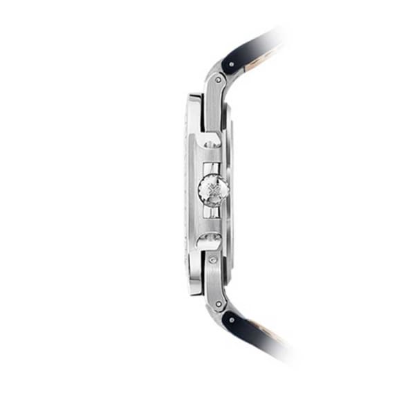 Patek Philippe Nautilus Men’s Watch 5724G-001. Patek Philippe Nautilus watch is the epitome of great luxury due to the almost palpable glamour of its round 18K white gold case and the stylish, blue crocodile leather strap with its diamond-adorned white gold deployment clasp. The strap dovetails well with the blue-black finish of the dial which features contrasting luminescent gold hands and iindex hour markers for good legibility. The dial also features date, moon-phases, small seconds, and power reserve display indicators. The watch’s bezel is paved with 44 baguette diamonds.