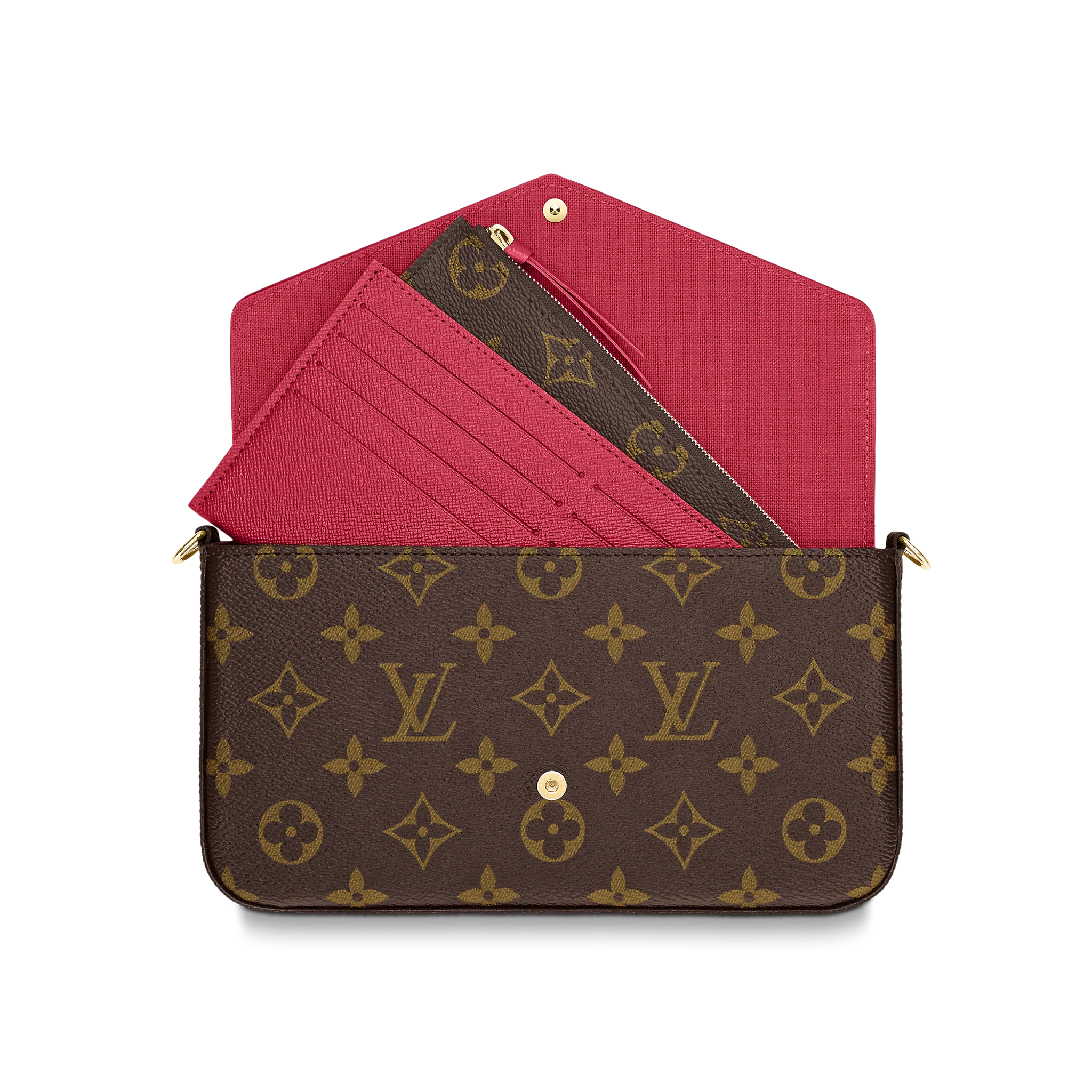 The Pochette Felicie in Monogram canvas is a stylish solution to carry and organize daily essentials. This versatile pouch features two removable pockets, including one with several card slots. It can be carried as a clutch or a shoulder bag thanks to a removable gold-tone chain.