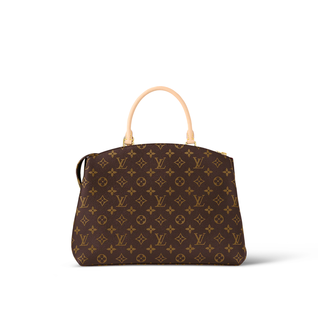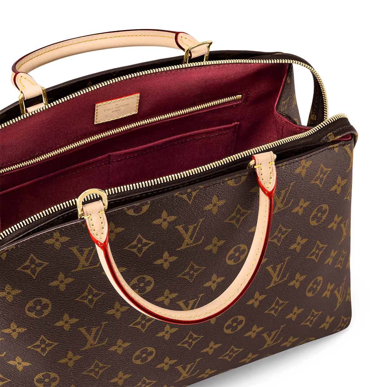 Inspired by the iconic Lockit from 2011 and the shape of the Montaigne launched in 2014, the new Grand Palais tote is as versatile as it is feminine. Made from Monogram canvas with natural-leather trim, its interior features a vivid red lining and a L patch. The removable strap and top handles give carry options.