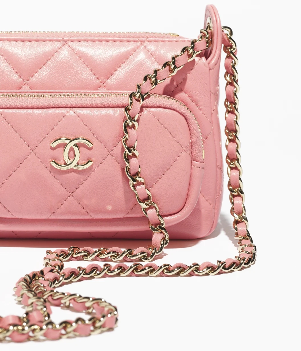 • CLUTCH WITH CHAIN Shiny Crumpled Lambskin & Gold-Tone Metal Light Pink