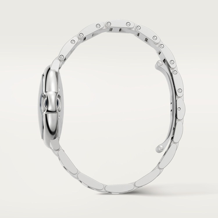 Floating like a balloon and as blue as the cabochon safely nestled in its side, the Ballon Bleu watch by Cartier adds a dash of elegance to male and female wrists alike. Roman numerals are guided on their path by a deep blue winding mechanism. With the convex curves of the case, guilloché dial, sword-shaped hands, and polished or satin-finish links of the bracelet...the Ballon Bleu watch by Cartier floats through the world of Cartier watchmaking.