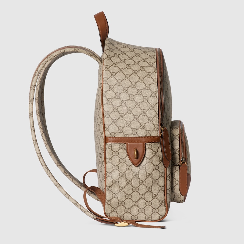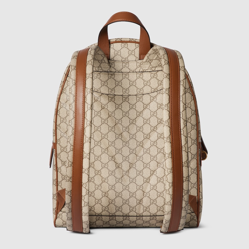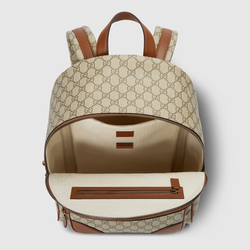 The new GG Emblem collection for men's travel reinterprets the House’s history of elegance and craftsmanship. This backpack is crafted from the new beige and dark brown GG Monogram coated fabric and features versatile inside pockets and an outside D-ring to attach accessories.