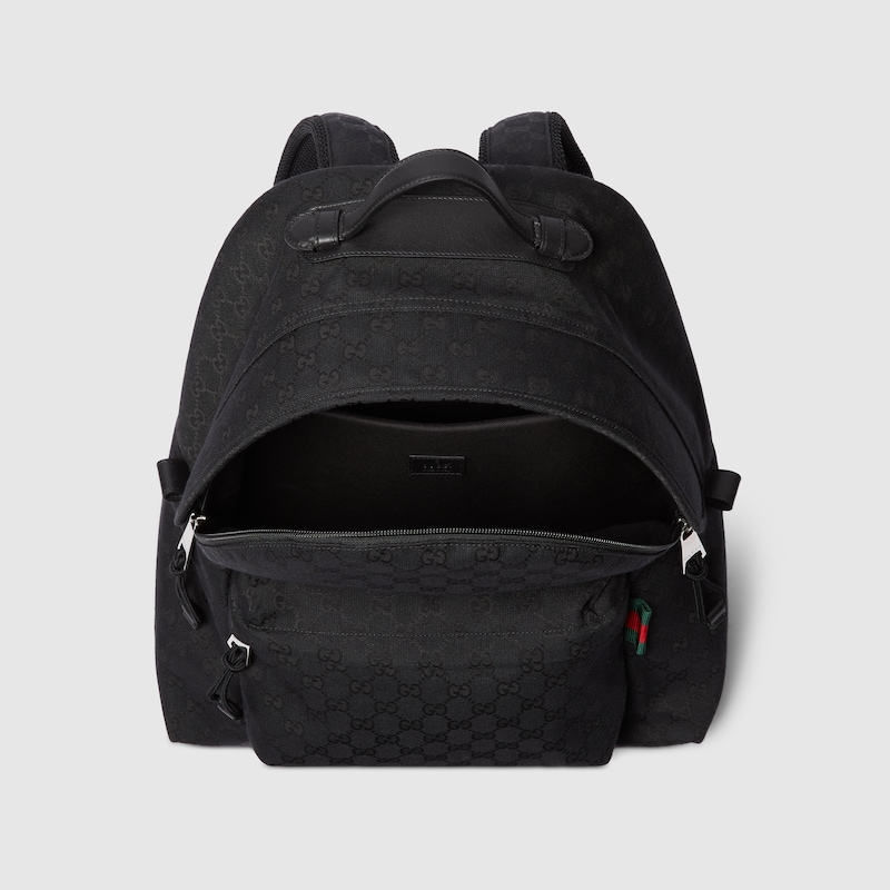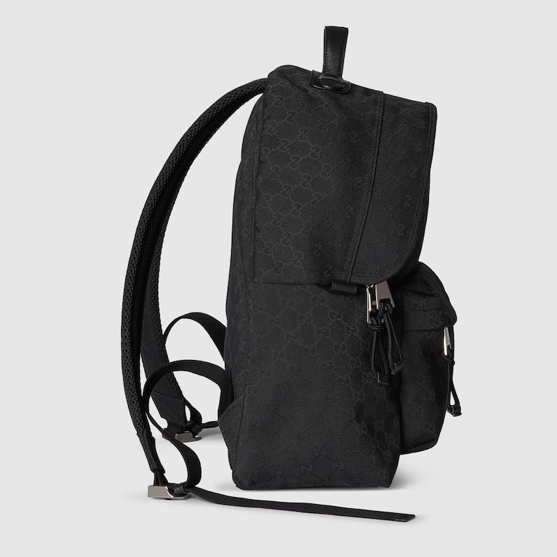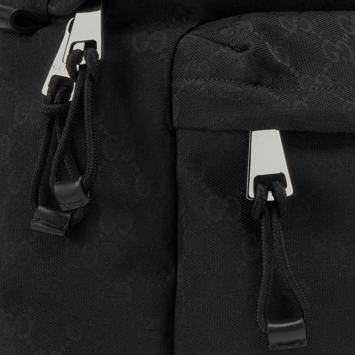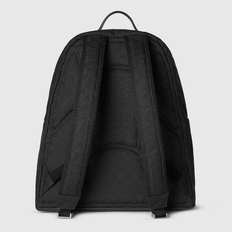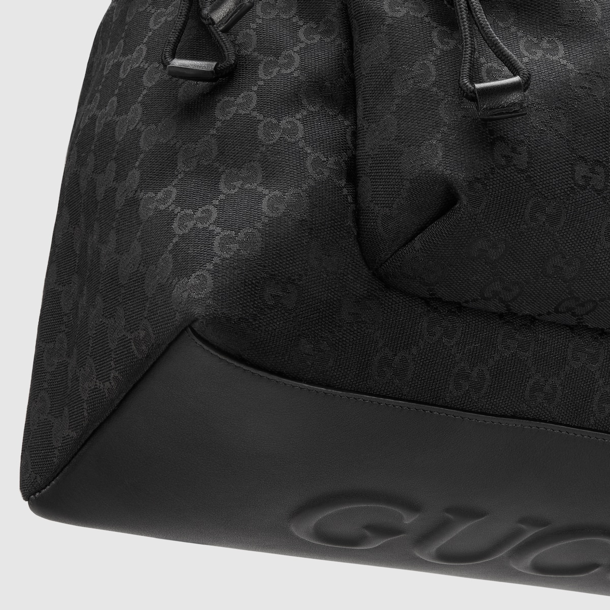 In the Spring Summer 2025 collection, softly-structured men's bags combine craftsmanship and functionality with a smooth texture and practical closures. This backpack appears in all black GG canvas. A subtle embossed Gucci logo defines the base.