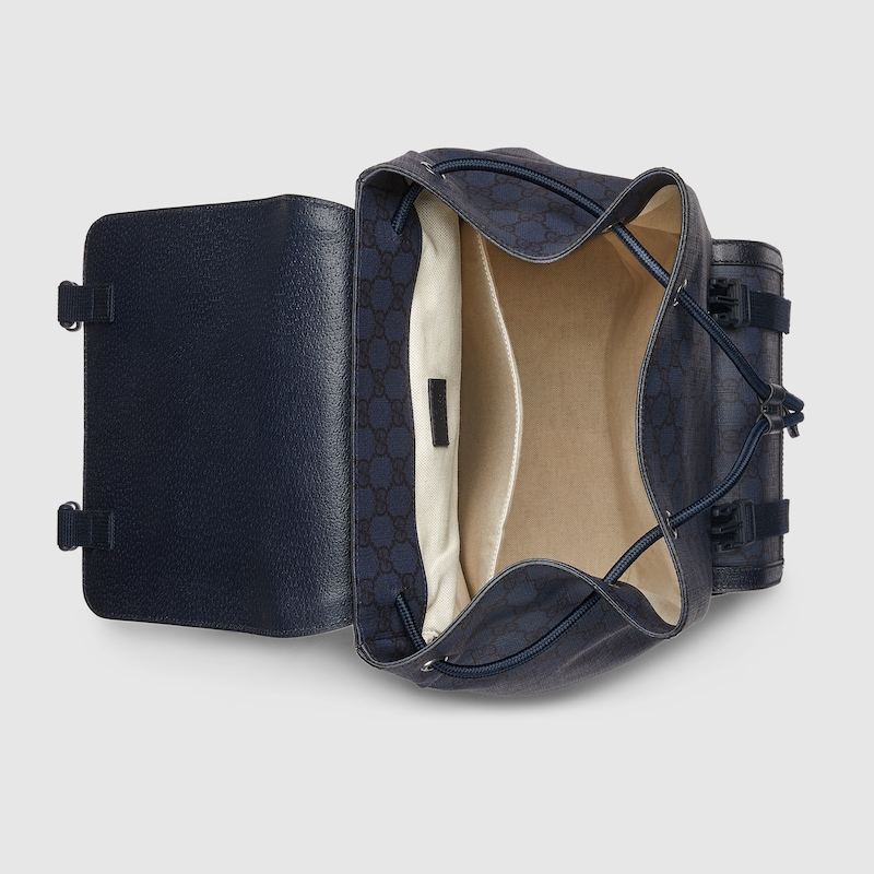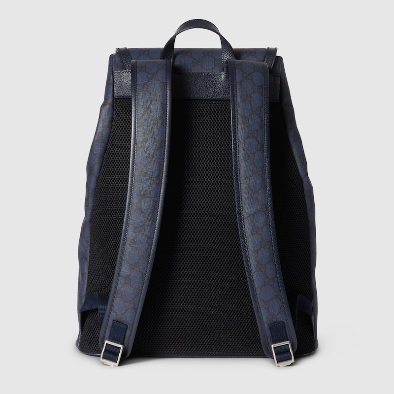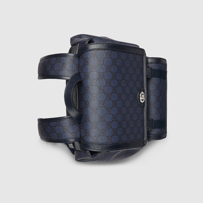 The Ophidia selection of men's bags, including mini cross-body bags, briefcases and totes has been reshaped with functional details. Featuring a GG Supreme canvas construction in timeless color palettes, the Double G motif defines each style as an integral design element. Here it appears on a tonal blue backpack.