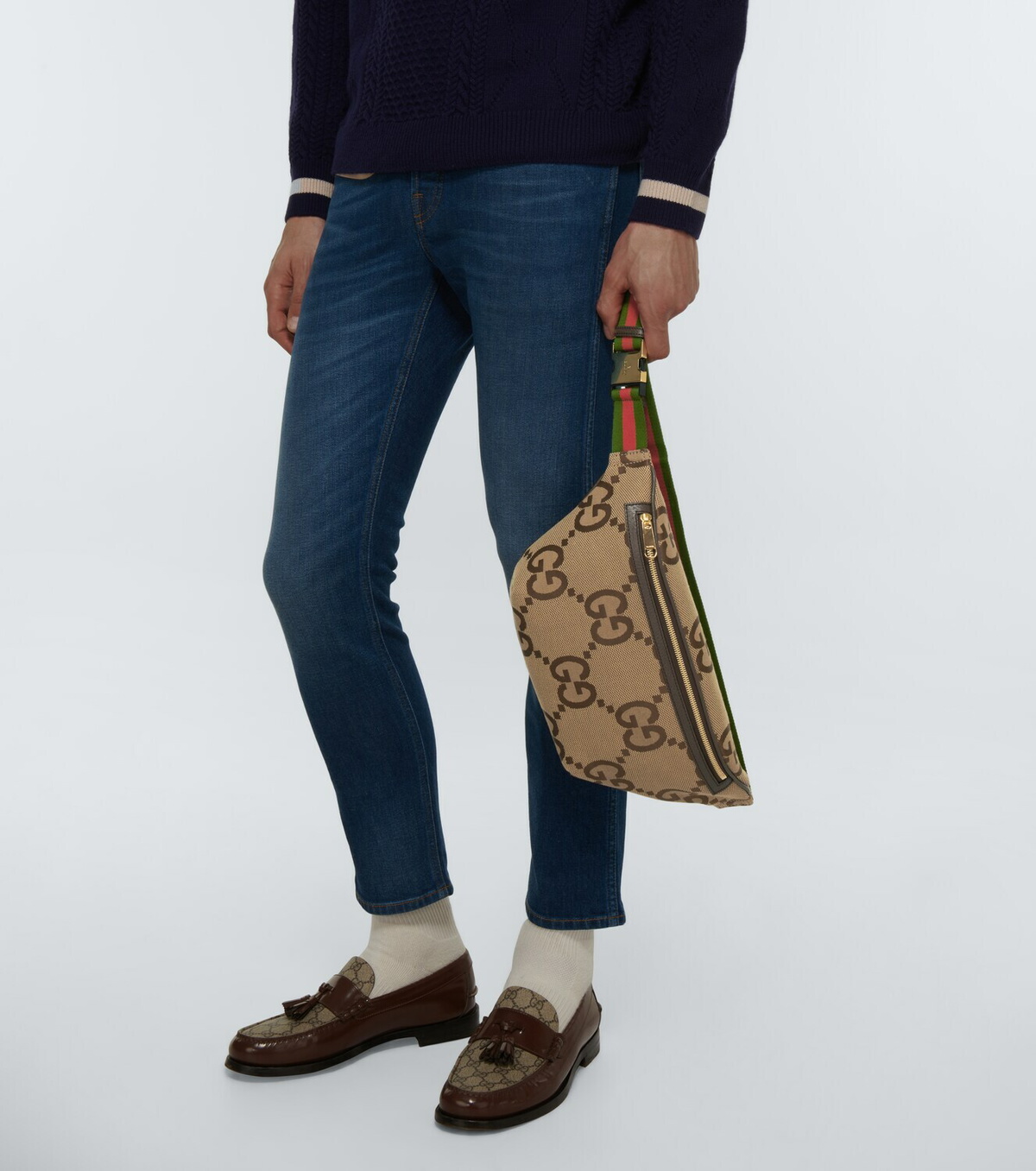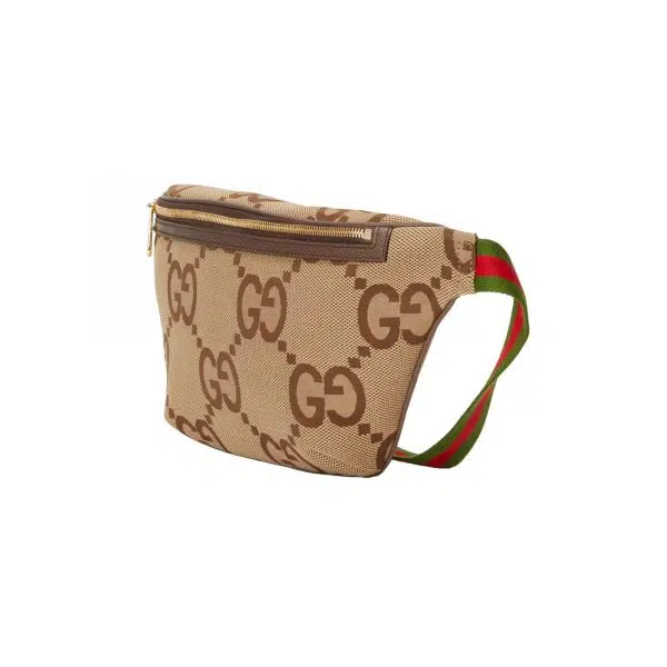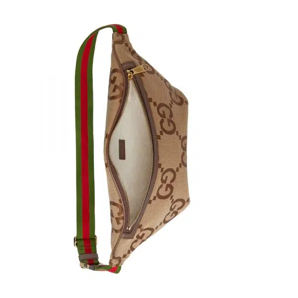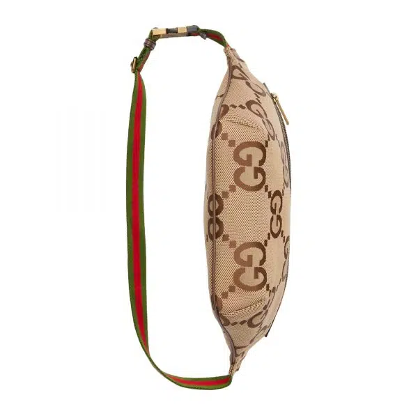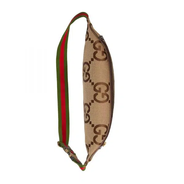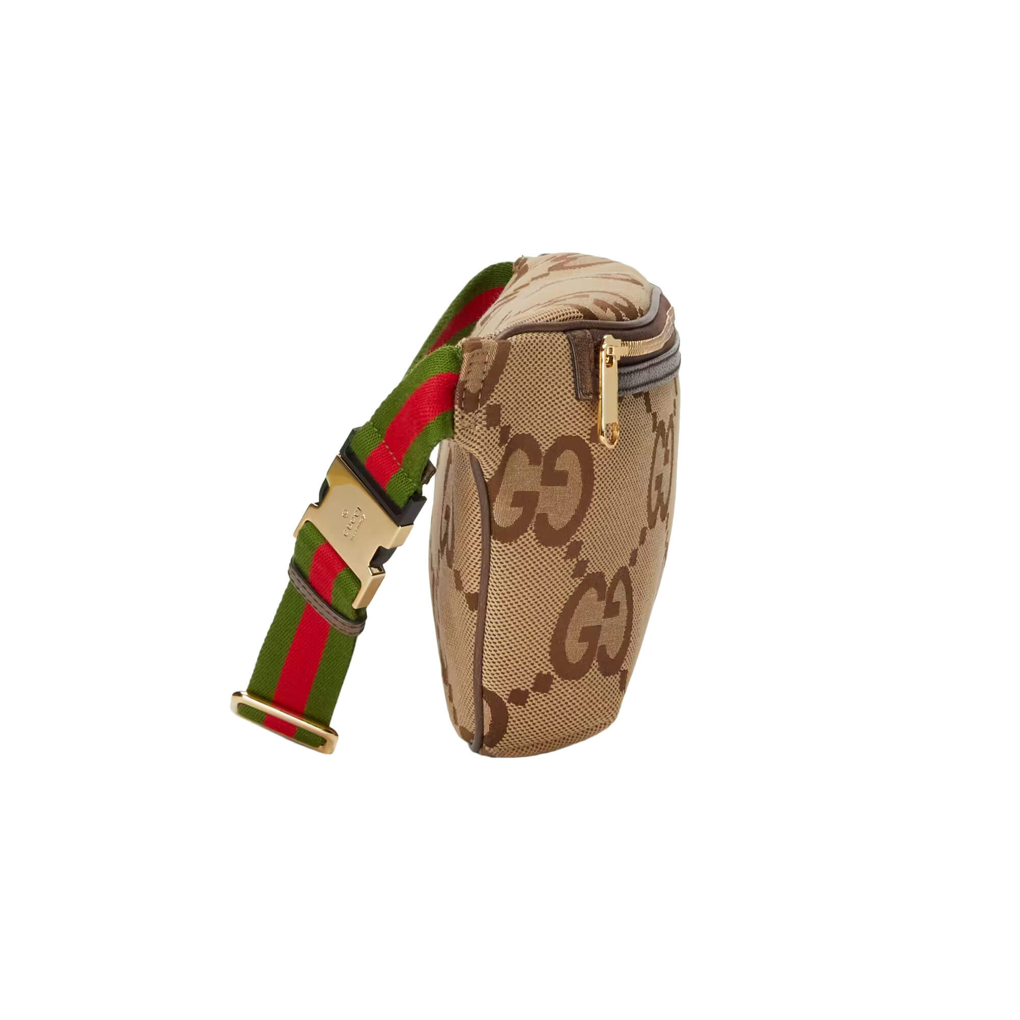 Made in Italy from Jumbo GG canvas, this Gucci belt bag is trimmed in brown leather and has a colorful strap.