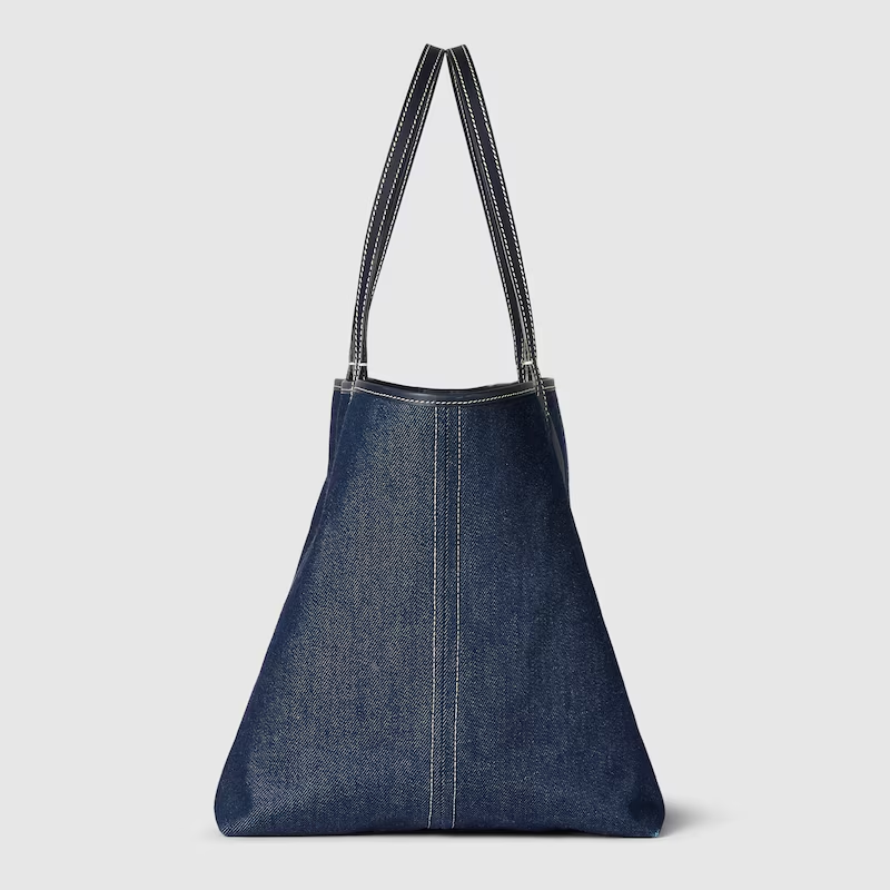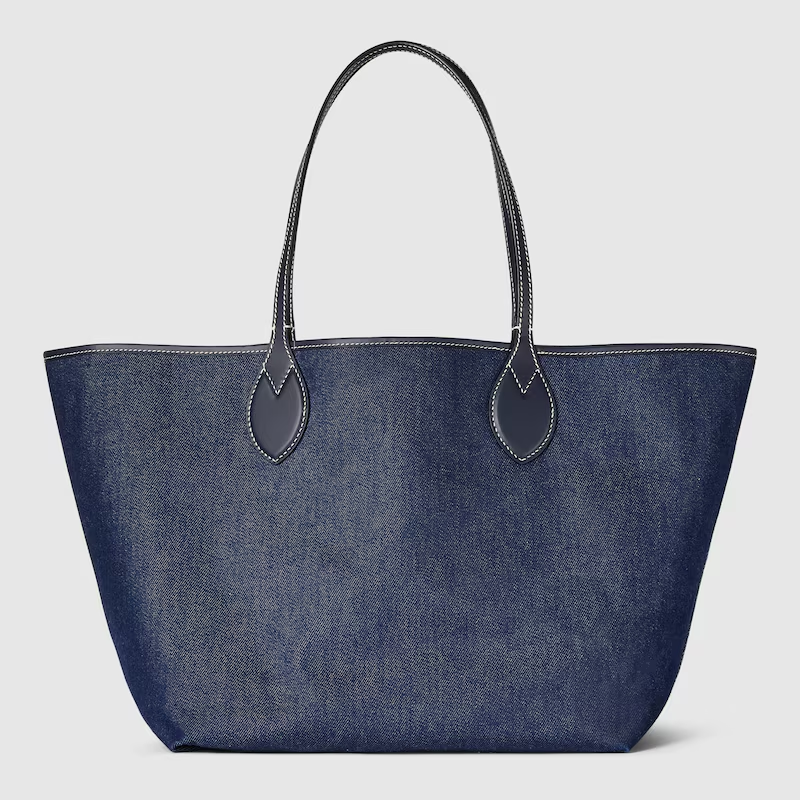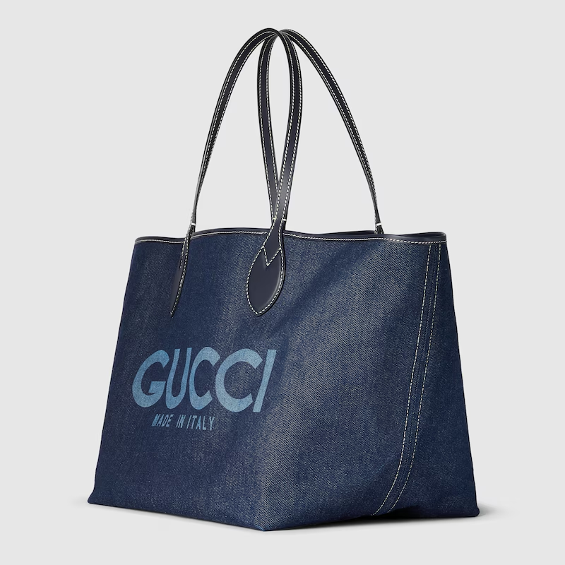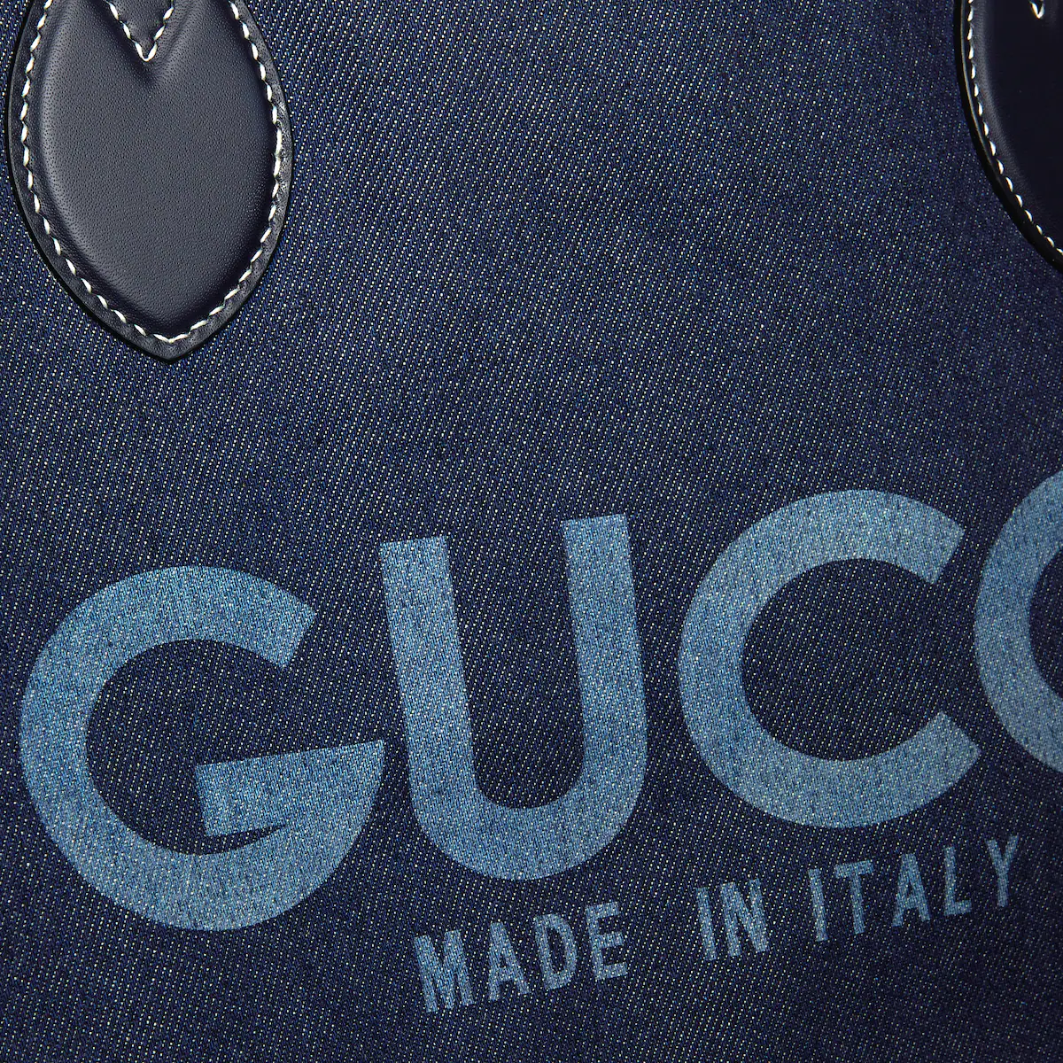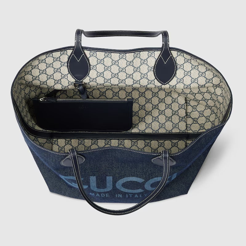 Introducing a reversible style with two distinct looks in one piece, this Gucci Totissima tote bag is crafted with denim on one side, and GG Supreme on the other. The medium size is complete with a detachable pouch. The name Totissima emphasizes an enduring style and functionality.