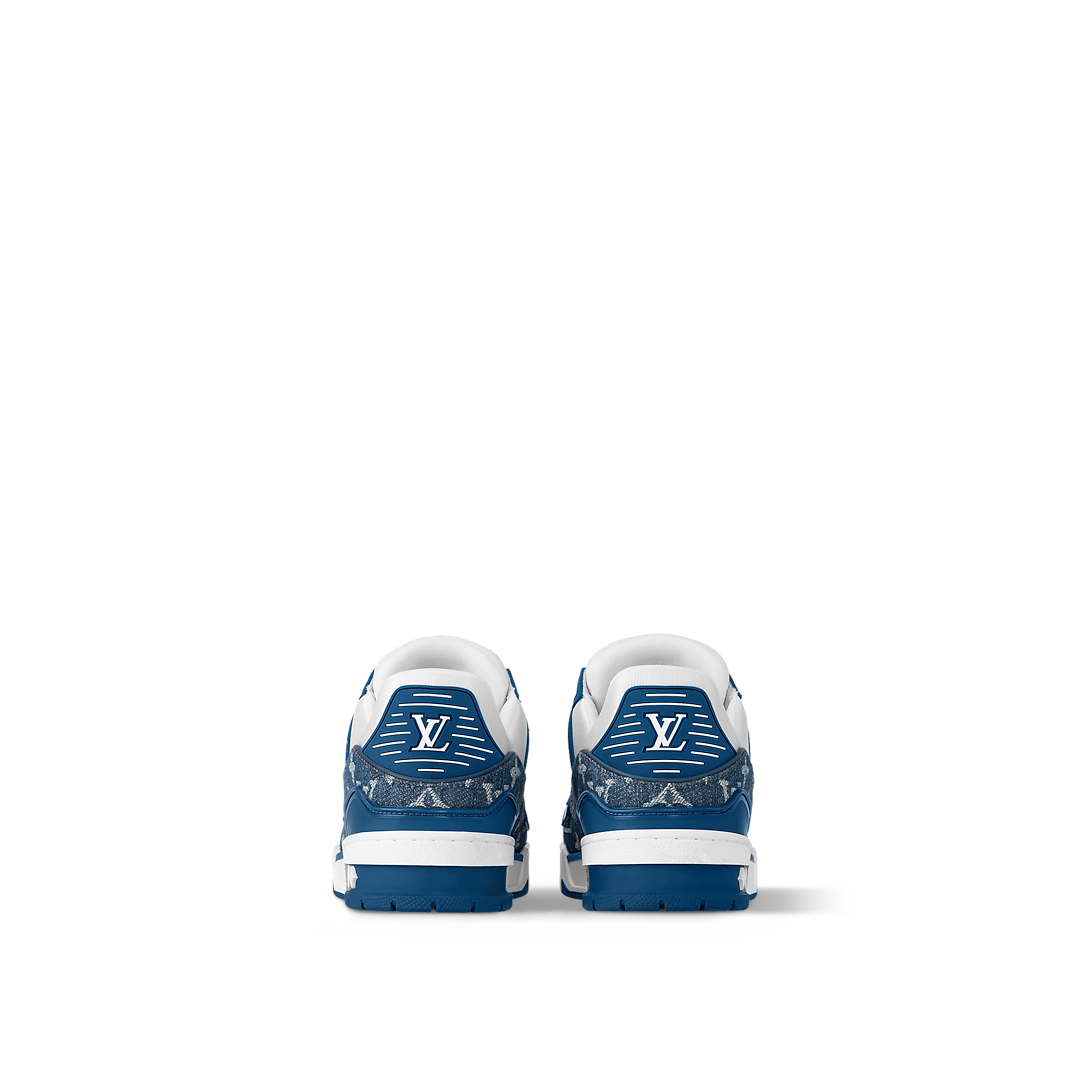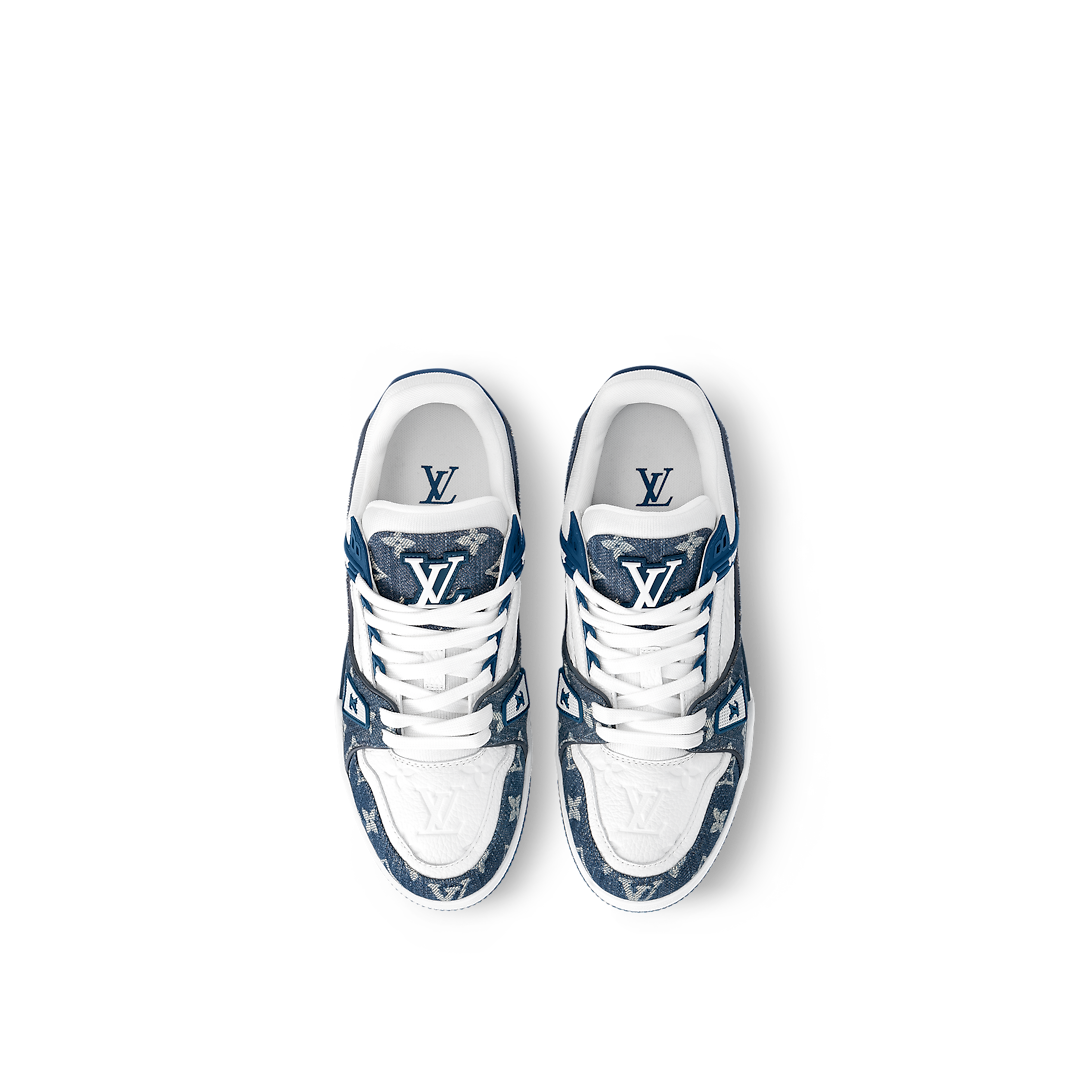 For the first time, the cult LV Trainer sneaker, a staple of the men's collection, is revisited for women in calf leather and Monogram denim. This classic design, created by Virgil Abloh, references vintage basketball sneakers. It features numerous signature details, including the LV Initials on the tongue and side, and Monogram Flowers on the outsole.