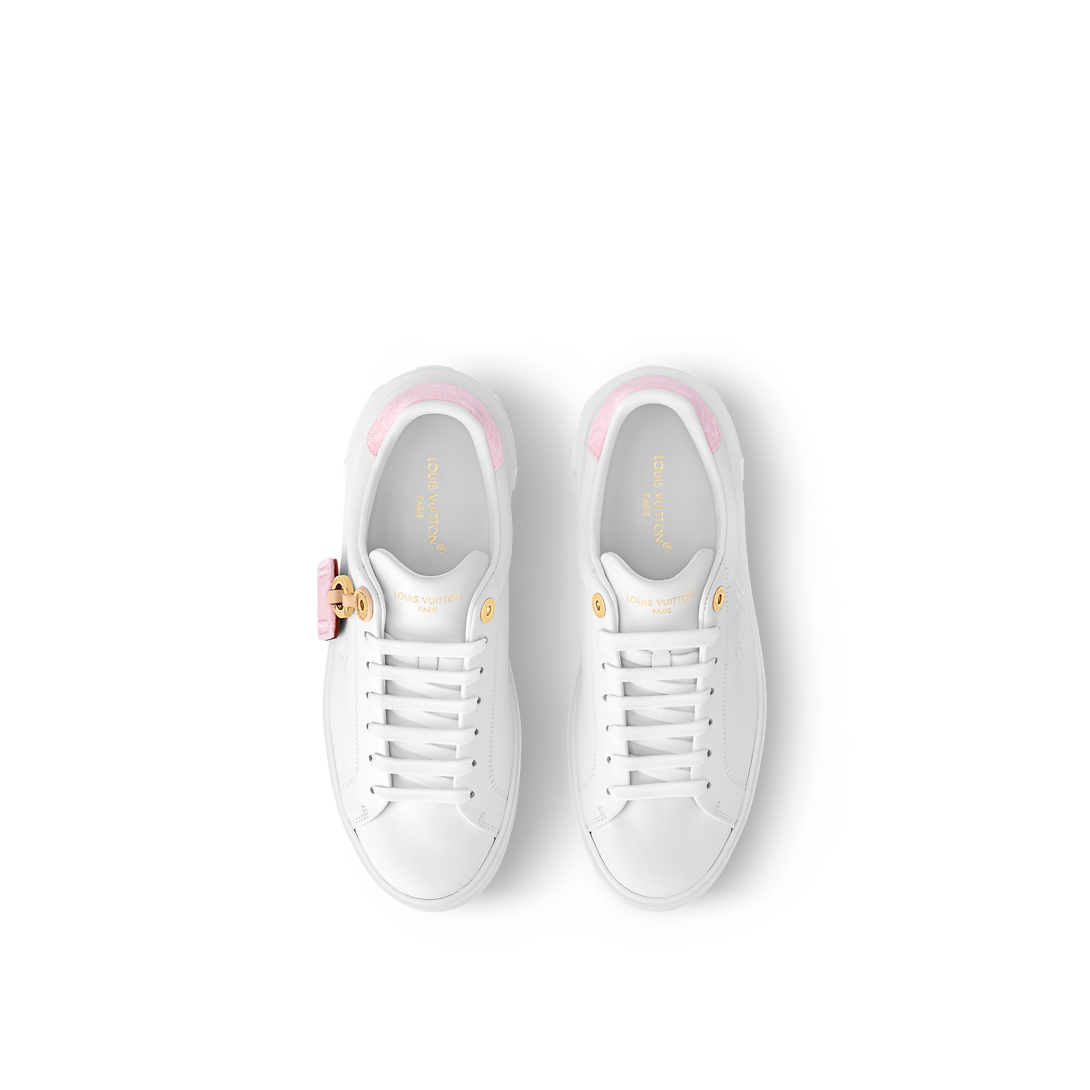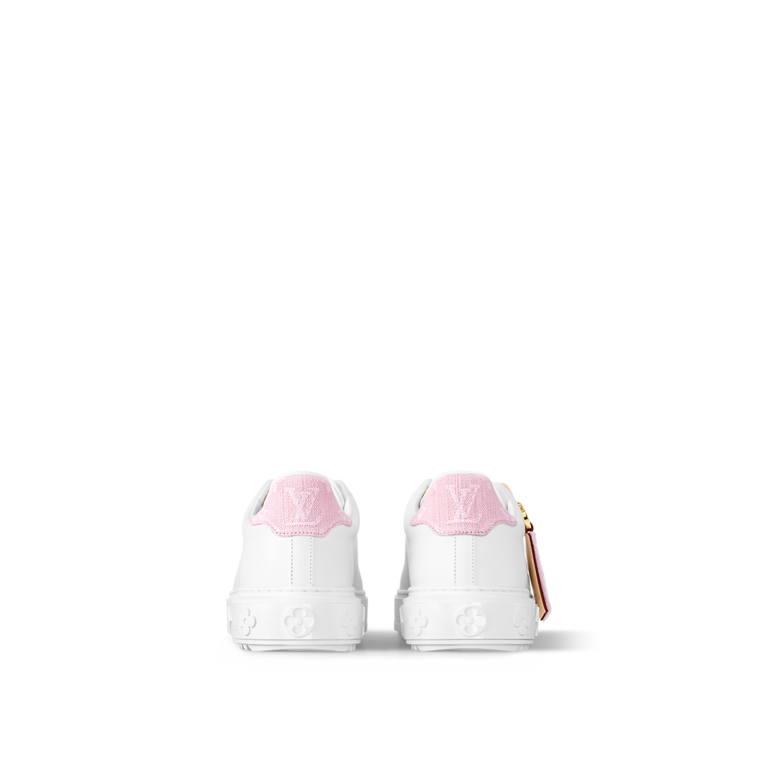 This edition of the Time Out sneaker combines smooth calf leather with trim in Monogram denim. Referencing the House's travel heritage, the upper is embellished with a luggage-style label hanging from an engraved, gold-toned ring. This classic model comes on an elevated rubber outsole decorated with Monogram Flowers.