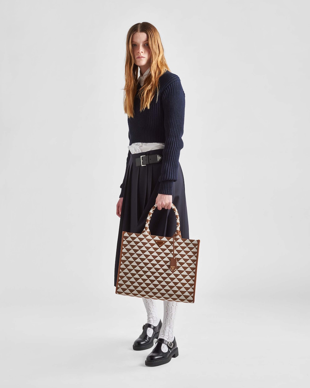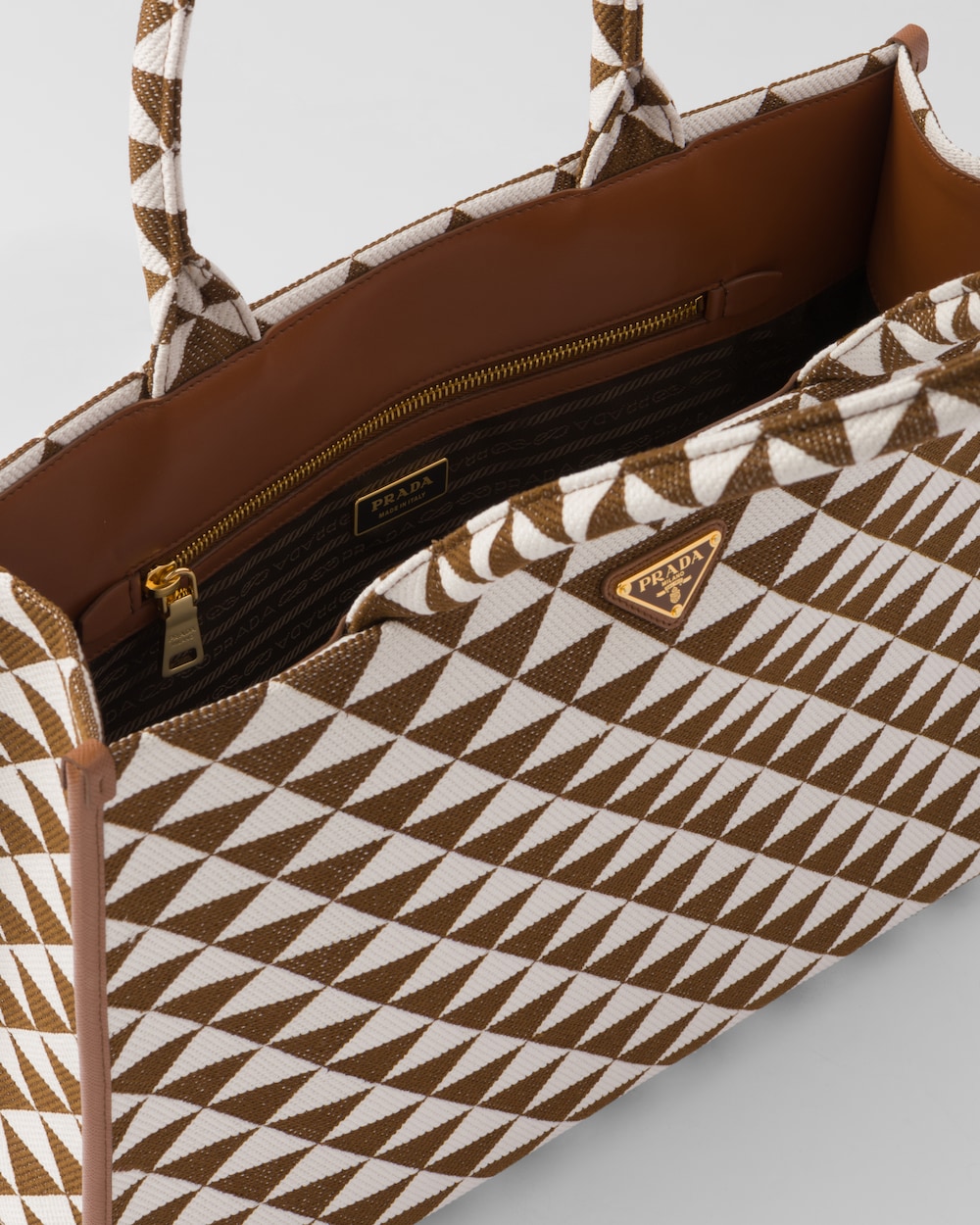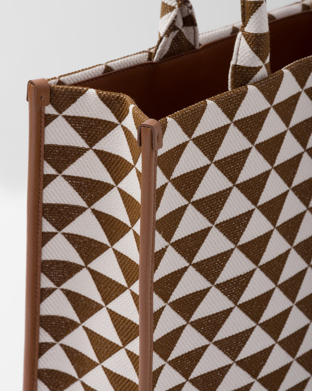 Introduced for the first time on trunks designed by Mario Prada, the Prada triangle expresses uniqueness and modernity through its universal, minimalist shape that is reinvented in a different way each season. Here, the geometric design is transformed into a sophisticated yet modernist pattern that plays with contrasting colors and decorates this sleek tote bag. Details in the brand's iconic Saffiano leather embellish the design.