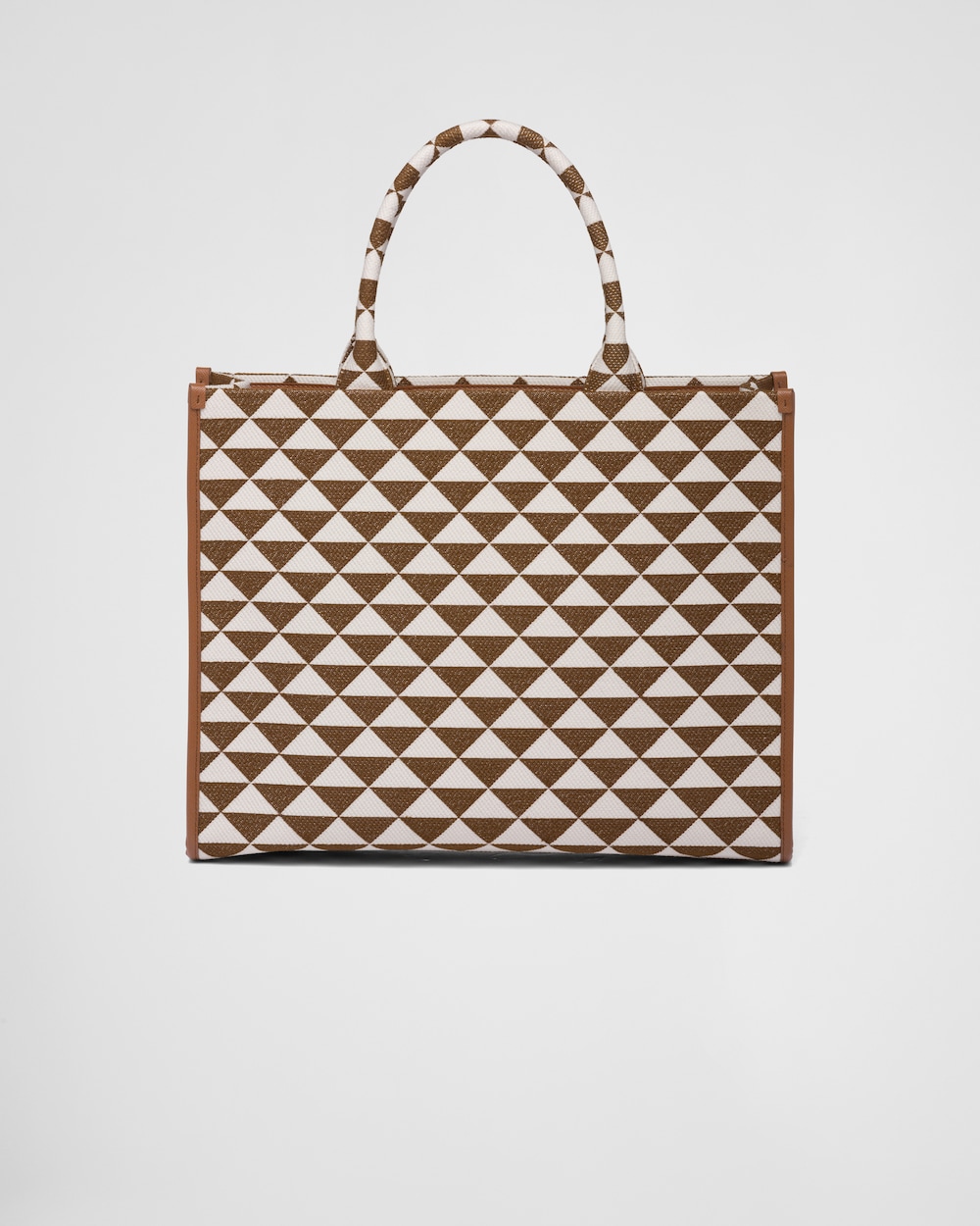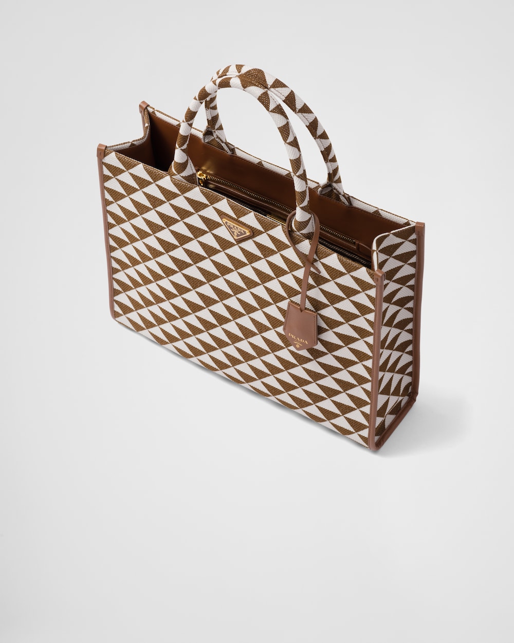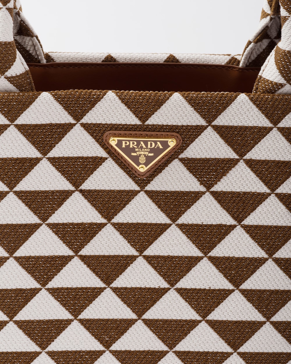 Introduced for the first time on trunks designed by Mario Prada, the Prada triangle expresses uniqueness and modernity through its universal, minimalist shape that is reinvented in a different way each season. Here, the geometric design is transformed into a sophisticated yet modernist pattern that plays with contrasting colors and decorates this sleek tote bag. Details in the brand's iconic Saffiano leather embellish the design.